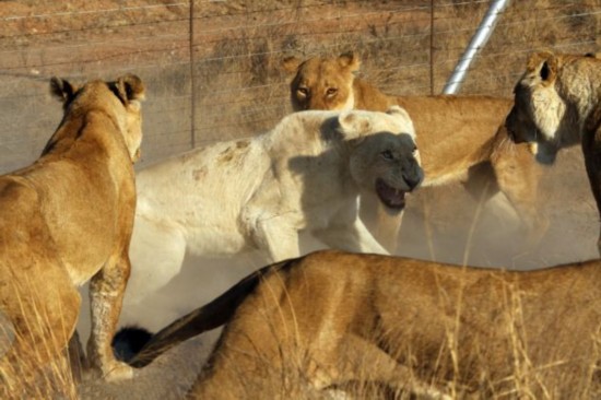 在这起领土纷争中,这只白色雌狮子的同伴撤退后,留下它孤军奋战。在鬣狗群的威逼下,它仍然不屈地坚持战斗。双方互相冲撞、捶打和撕咬,战况十分激烈。白色雌狮子被围困、和攻击的场景令即使是经验丰富的向导都很汗颜。尽管双方的交战迅速猛烈,但企图带伤逃跑的雌狮子才是最震撼人心的。