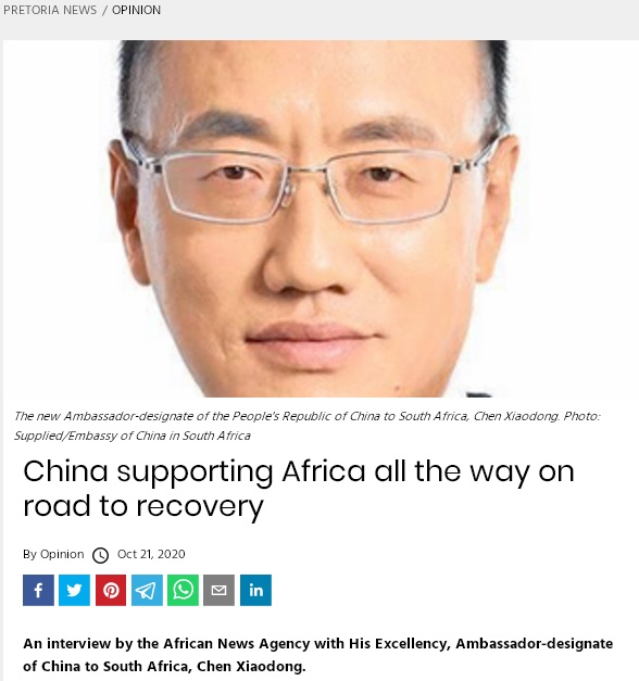 近日,中国驻南非大使陈晓东接受非洲通讯社书面专访,就中南团结抗疫、疫后复苏、人文交流和多边协作等回答记者提问。10月21日至23日,南非主流媒体《星报》、《比陀新闻报》及第二大新闻网站独立传媒网站分三期连续刊登专访实录。全文如下: