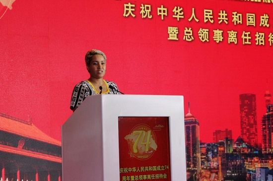 招待会最后,唐中东总领事和主宾们举杯相庆,来宾纷纷祝贺中华人民共和国成立74周年,盛赞中国发展伟大成就和中南关系丰硕成果。大家畅叙友谊、倾诉别情,共话合作、展望未来,会场氛围热烈友好。