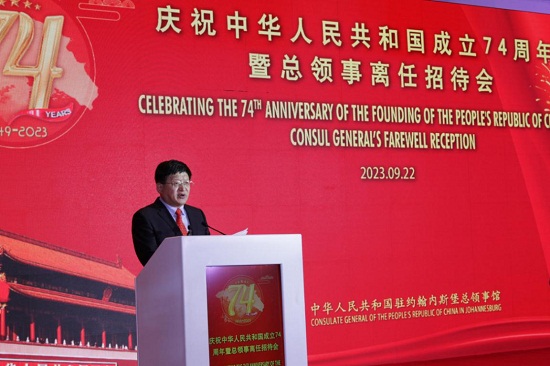 2023年9月22日,驻约翰内斯堡总领馆举办招待会,热烈庆祝中华人民共和国成立74周年,亲切送别即将离任的唐中东总领事。南非国民议会事务主席弗罗里克、豪登和自由州两省省长、议长等18位省领导、约堡和艾库鲁勒尼两市市长和议长、各政党豪登省委领导、各国驻约堡总领事、当地学者和媒体人士、在南中资机构和华侨华人代表等250多位嘉宾出席。南非广播电视台、独立传媒集团网络版、《索维托人报》、《星报》及人民日报、新华社、中央广播电视总台等多家南中媒体参加并作报道。