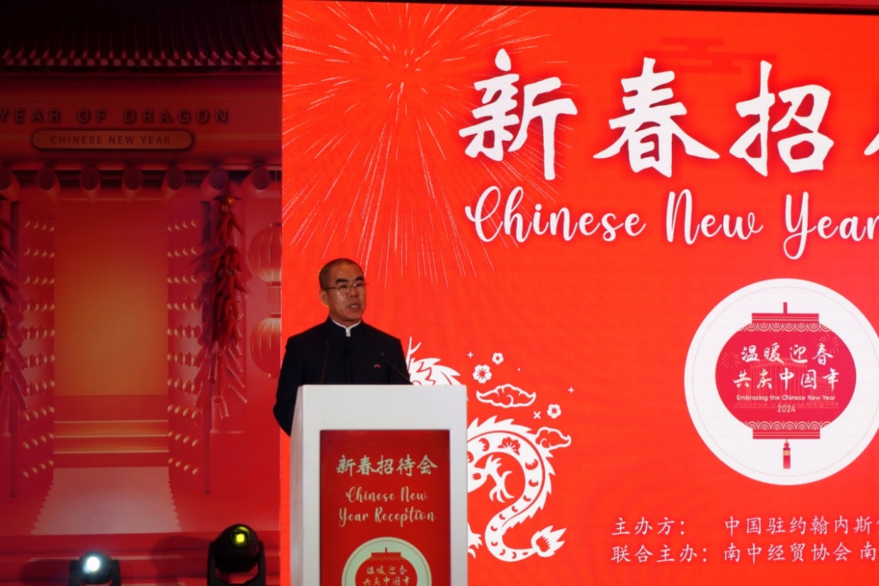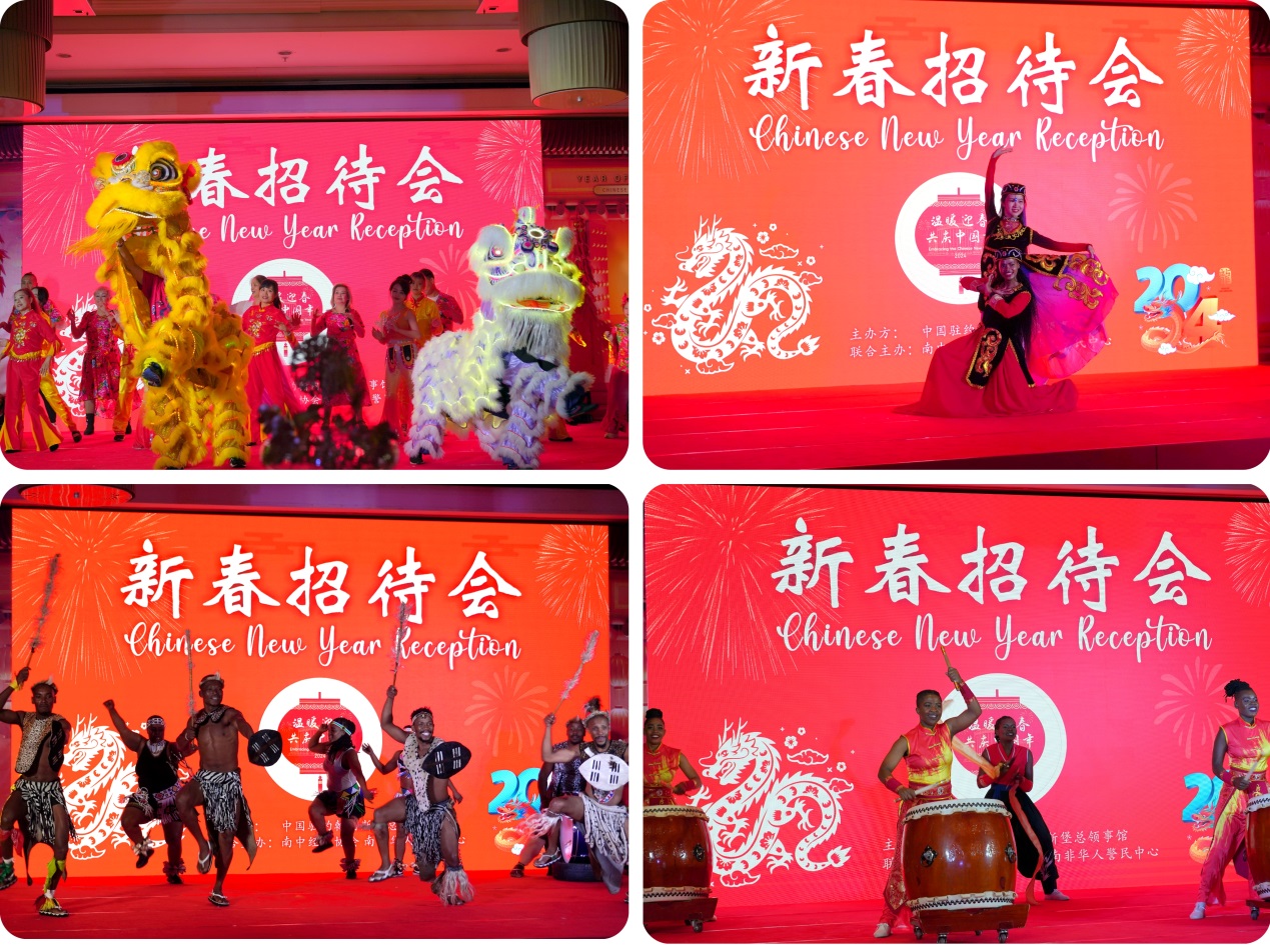 1月19日,驻约翰内斯堡总领馆举办2024年“温暖迎春·共庆中国年”招待会。潘庆江总领事、南非自由州省省长、豪登省议长出席并致辞,领区各界代表约300人欢聚一堂。
