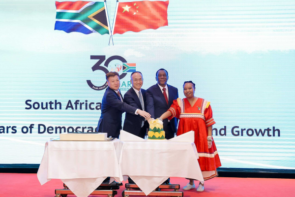 陈晓东祝贺新南非成立30周年,高度评价南非取得的发展成就和为世界繁荣稳定所作贡献,表示近年来在习近平主席和拉马福萨总统的战略引领下,中南两国关系实现跨越式发展,开启构建高水平中南命运共同体的新时代。今年9月,中非合作论坛峰会将在北京举办。中方愿同南非一道,共同创造中南、中非关系更加美好的明天。