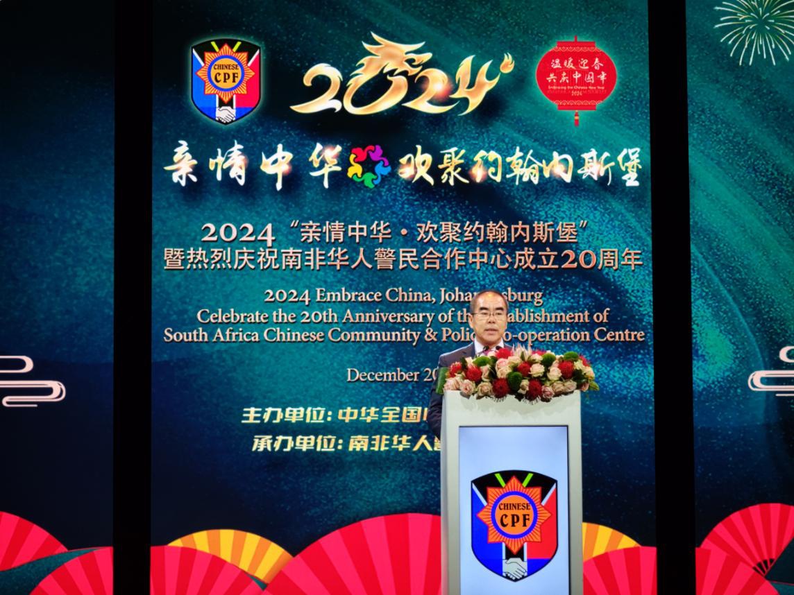 12月4日,驻约翰内斯堡总领事潘庆江出席中国侨联“亲情中华·相聚约翰内斯堡”暨庆祝南非华人警民合作中心成立20周年晚会,南非副总统代表、南非警察部副部长、豪登省地方政府官员以及侨界代表和友人等1000余人参加。