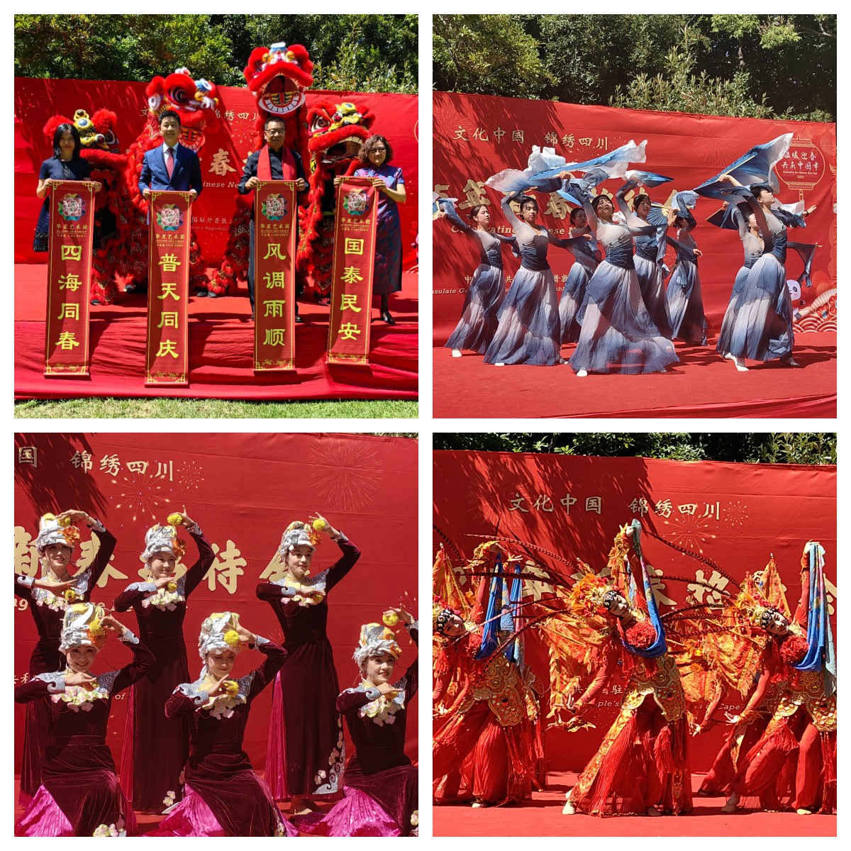 招待会现场喜庆热烈,年味浓浓,来自四川省、开普敦华星艺术团的演出精彩纷呈,烧烤、饺子、书法、茶艺等让嘉宾们体验了丰富的中国美食和文化。