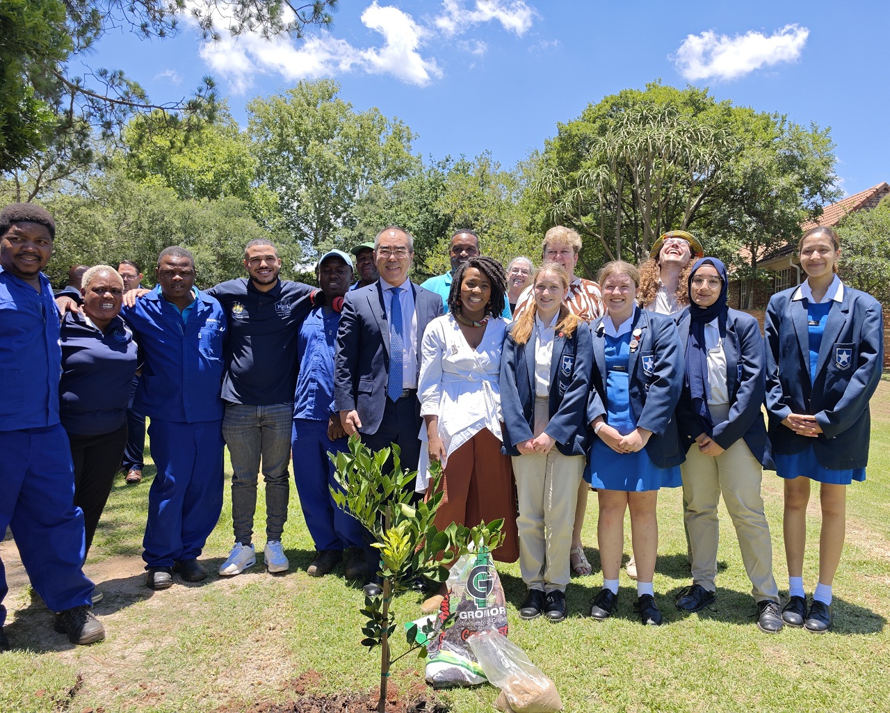 2025年1月15日,驻约翰内斯堡总领事潘庆江出席向约堡Parktown女子高中捐赠果树的爱心助学活动,并与豪登省主管农业的副省长拉莫豪帕、学校校长戴维森及师生代表共同参加植树。