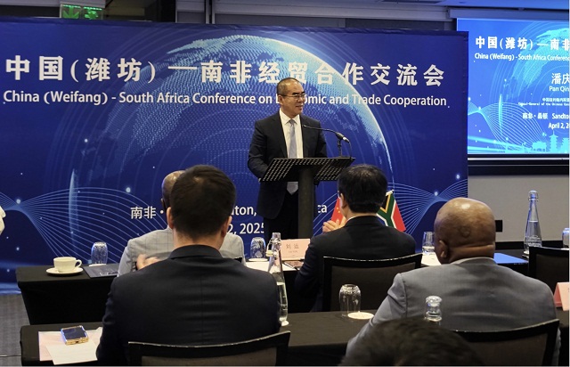 2025年4月2日,驻约翰内斯堡总领事潘庆江出席中国(潍坊)—南非经贸合作交流会并致辞。潘总领事介绍中南关系和经贸合作在两国元首引领下取得的成就和面临的光明前景,宣介习近平主席会见国际工商界代表重要讲话精神,表示中国式现代化成果为包括南非在内的世界各国带来发展新机遇和积极稳定的正能量,与中国同行就是与机遇同行,相信中国就是相信明天,投资中国就是投资未来。希望双方各界人士充分把握中南新时代全方位战略合作伙伴关系提供的重要机遇,加强相互交流和有效对接,持续为中南地方交往和经贸合作以及中南关系发展贡献力量。潍坊市委书记刘运及代表团成员、西兰德市市长塔贝、多位副市长及豪登省经济发展厅和农业厅等地方官员和中南商会、企业代表百余人出席会议。