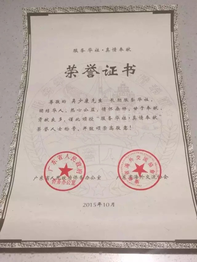 南非著名华侨南非华人警民合作中心主任吴少康先生荣获殊荣,被授予“服务华社·真情奉献”荣誉人士称号。