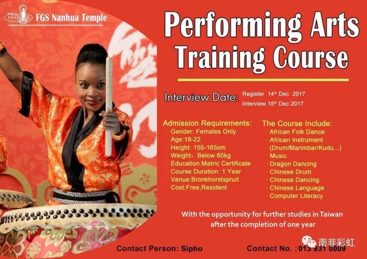 因为演出任务不断加重扩大,佛光山南华寺天龙队近期紧急招聘南非当地女学员。