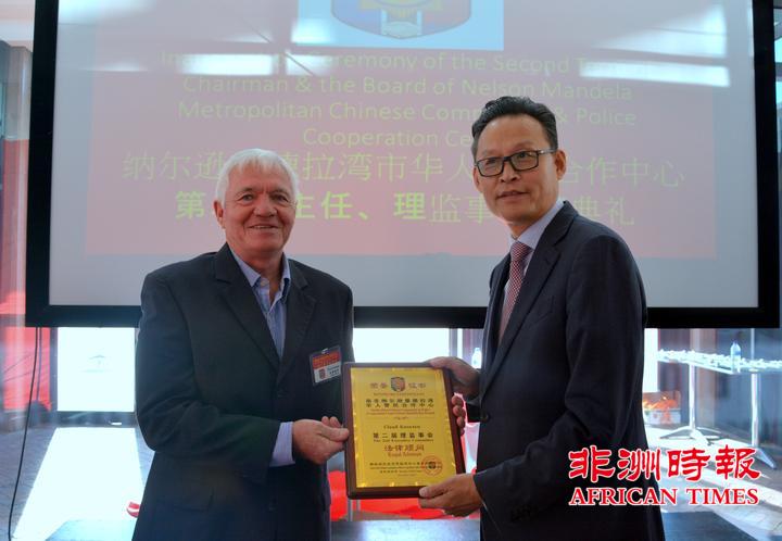 曹利副总领事代表中国驻开普敦总领馆向纳尔逊·曼德拉湾市华人警民中心举办第二届主任、理监事会成员就职典礼表示祝贺,他对PE华人警民合作中心过去两年来的工作给予充分肯定,希望新一届领导班子能够勇挑重担,不辱使命更加地奋发有为,努力成为南非侨社的优秀代表。