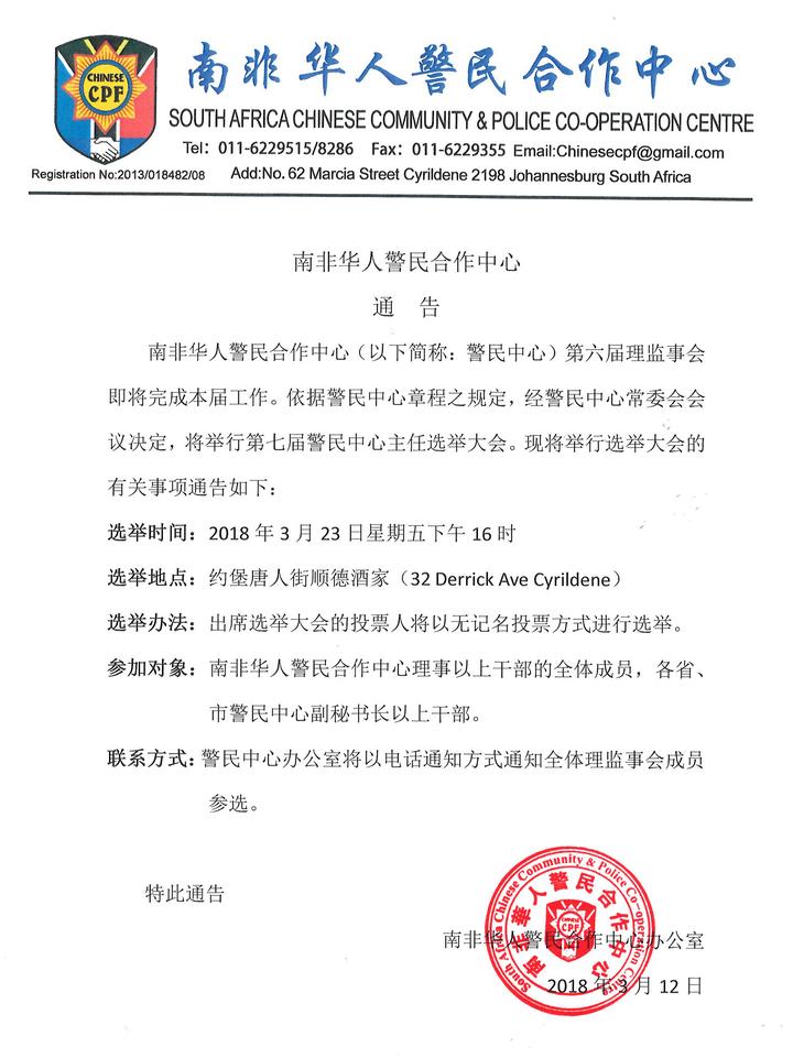 南非华人警民合作中心换届选举通告