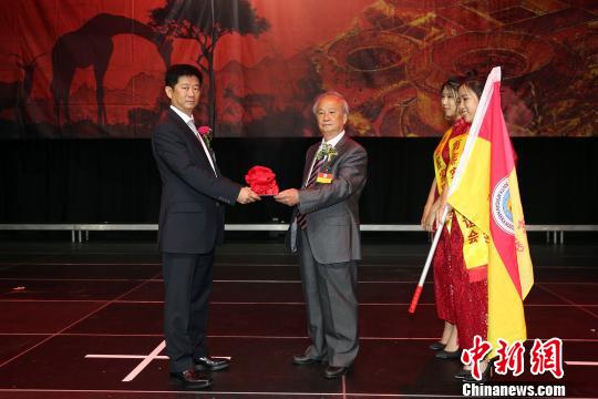 在就职仪式上,新当选的温耀滨会长(左)从第四届会长陈云生手中接过了联谊会的印信和会旗。 宋方灿 摄