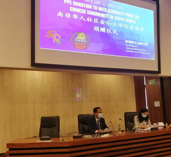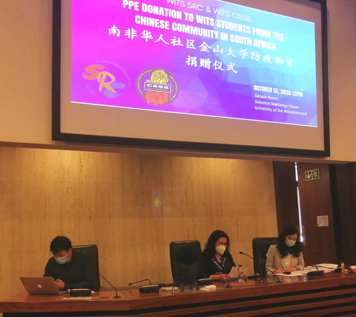 2020年10月13日中午12点,经过学校层层审批,在确保社交距离的前提下,金山大学中国学生学者联合会联袂金山大学学生会(SRC)共同在金山大学贵宾及外交官专用接待会议室—议员厅(Senate Room)举办了“南非华人社区金山大学防疫物资捐赠仪式”。金山大学学生事务部部长Jerome September、学生事务管理办公室主任Jabu Mashinini、金山大学国际学生办公室主任Gital Patel、金山大学学生会主席Thuto Gabaphethe、南非学生大会(SASCO)金山大学分部前主席Nkateko Muloiwa及进步青年联盟(PYA)金山大学分部财务部长Samkele Sigam等出席会议。