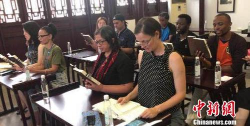 中新网衢州7月5日电(记者 周禹龙 实习生 周悦磊 通讯员 徐聪琳 周昕)“子曰:学而时习之,不亦说乎?有朋自远方来,不亦乐乎?人不知而不愠,不亦君子乎……”日前,孔氏南宗家庙内,有市民被问己堂传出的朗朗诵读声所吸引,而透过朱红色窗格,却看到“各种颜色的皮肤,各种颜色的头发”。