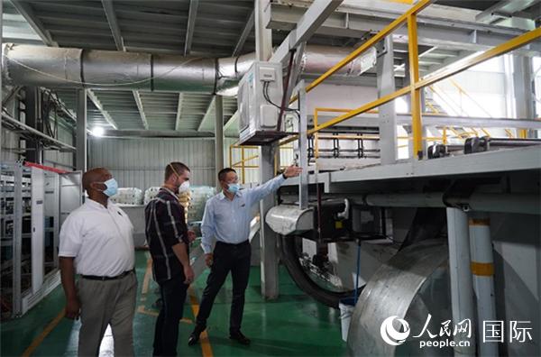 孙晓栋董事长带领本地企业代表参观工厂,介绍设备。(人民网 刘畅 摄)