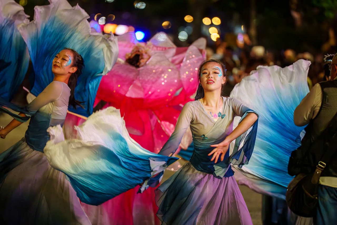 来自当地武术学校的孩子们带来了棍术表演,一路走来,藤木棍棒在他们手中呼呼作响,一招一式尽显中华武术的刚劲有力。时而凌厉地刺出,时而迅猛地横扫,棍影交错间,展现出十足的力量感和节奏感。与一群身着飘逸古装的舞者与棍术表演刚柔并济,遥相呼应。刚健的棍术与柔美的古典舞,一个似苍松挺拔,一个如弱柳扶风,一动一静,一刚一柔,却又在奇妙的韵律中达到了和谐统一,共同编织出一幅极具视觉冲击力的画面,让观众们沉浸在这奇妙的氛围中,如痴如醉。