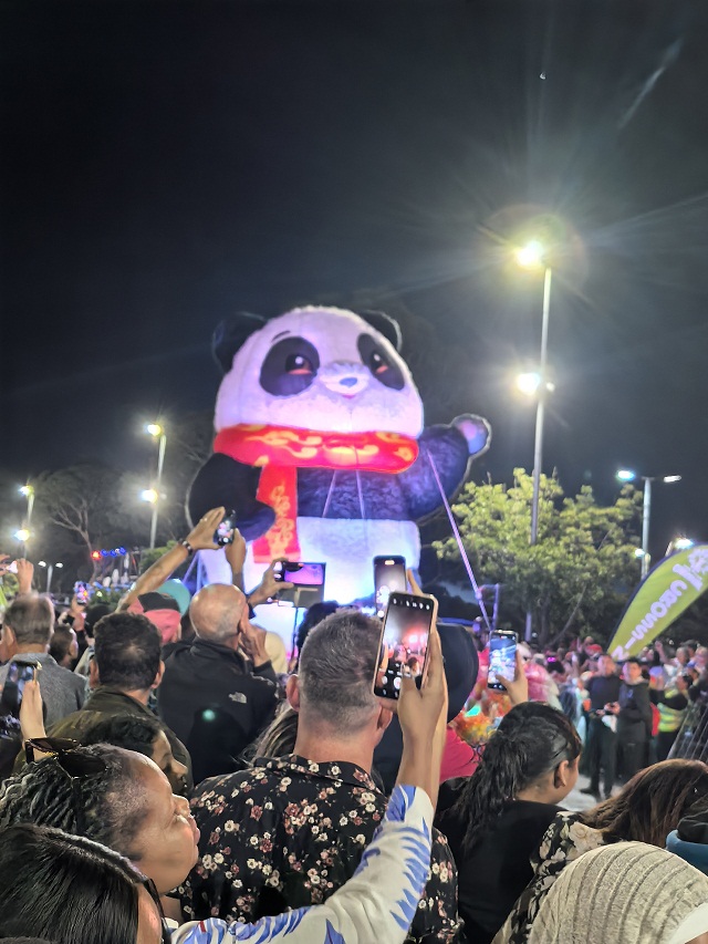 高达8米的巨型熊猫花车更是成为了全场焦点。憨态可掬的熊猫造型栩栩如生,黑白色调简洁而醒目,随着花车的移动左右转动,仿佛在与观众互动。当花车缓缓驶入游行队伍,立刻吸引了全场观众的目光,大家纷纷拿出手机拍照留念,现场响起了此起彼伏的惊叹声和欢呼声。熊猫花车上播放着南非当地民众耳熟能详的街舞歌曲,沿街所到之处观众一起引吭高歌,互动热烈。