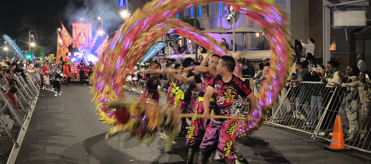 今年华人社区方阵的表演中,中国非遗元素丰富多样,两条焰火龙成为了全场焦点。这两条焰火龙造型精美,焰火龙的身体内部安装了巧妙的机械装置,在舞动时不仅能做出各种流畅的动作,还能从口中喷出绚丽的火花,瞬间点燃现场气氛。
