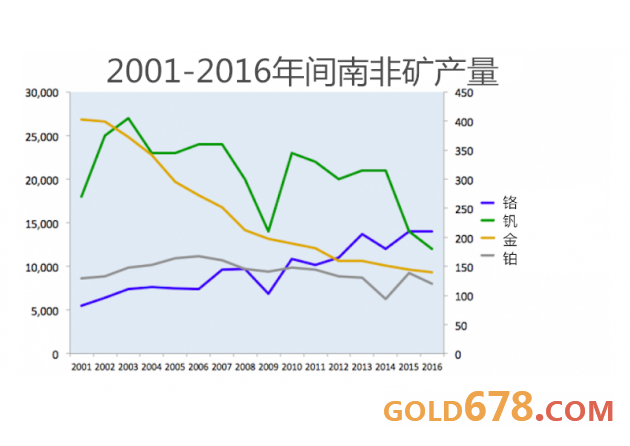 从图中的走势可以清晰地看到,近年南非的铬铁矿并未受到影响。自2001年以来黄金的产量已经下滑了65%,但同期铬的产量却上涨了155%。