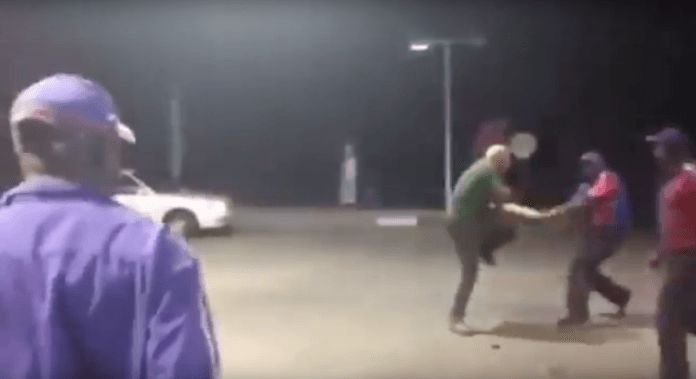 这是一段最新上网的视频。在南非的一个ENGEN加油站,服务人员挥舞着棍棒殴打一名男子。这名男子试图躲闪和反抗,但是明显寡不敌众。在仓促的逃跑中,他更是险些遭到汽车的碾压。