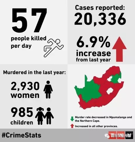 南非警察部长塞勒(Bheki Cele)刚刚公布了警方的最新统计数字,称2017/2018年期间,南非的谋杀案增加了6.9%,期间共有20,336人遇害,相当于每天有57人被杀。