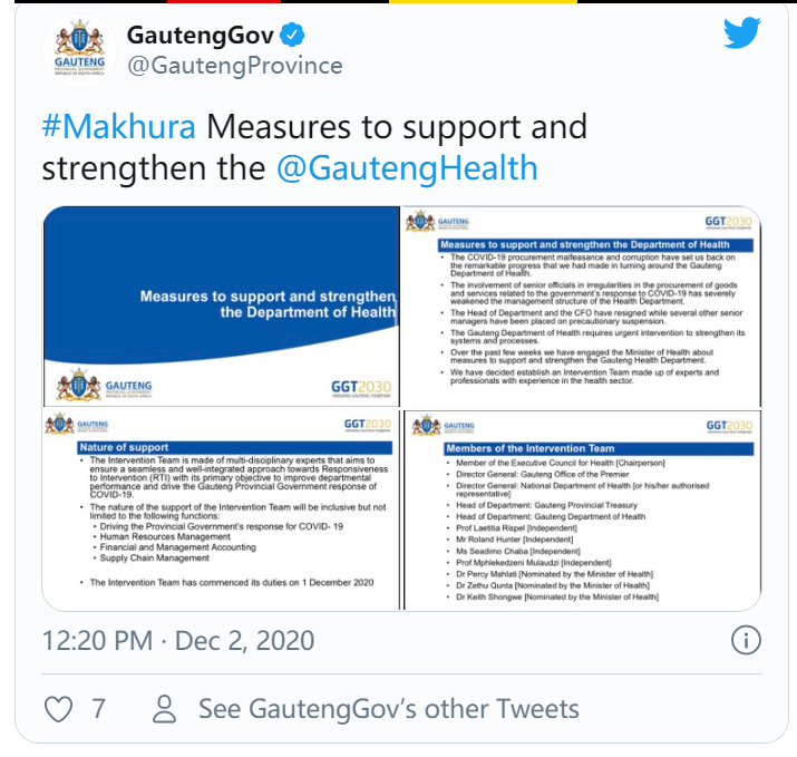 10月,在特别调查组的初步报告发现班迪勒·马苏库未能遵守《公共财政管理法》中规定的宪法和条例后,他在个人防护设备招标事件中解雇了班迪勒·马苏库。