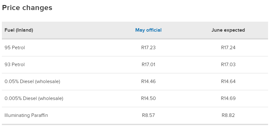 南非中央能源基金(Central Energy Fund)的月度数据显示,6月份汽油价格将小幅上涨,而柴油价格的涨幅可能更大。