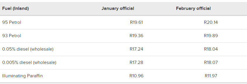 在燃料调整中唯一的好消息是LPGAS的最大零售价格将降低1.24兰特。燃油价格调整将于2022年2月2日(星期三)生效。