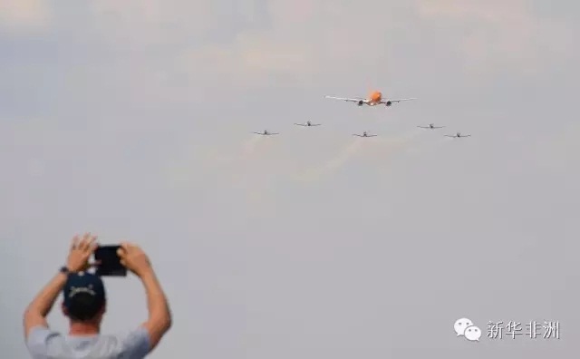 芒果航空的一架客机和银隼飞行表演队在南非比勒陀利亚附近的某空军基地进行护航表演。