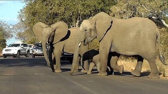 【环球网综合报道】据英国《每日邮报》12月5日报道,近日,一段群象保护幼崽过马路的暖心视频在YouTube上迅速蹿红。该视频拍摄于南非克鲁格国家公园,视频中,一群大象齐心帮助幼崽过马路,画面温馨,令人感动。