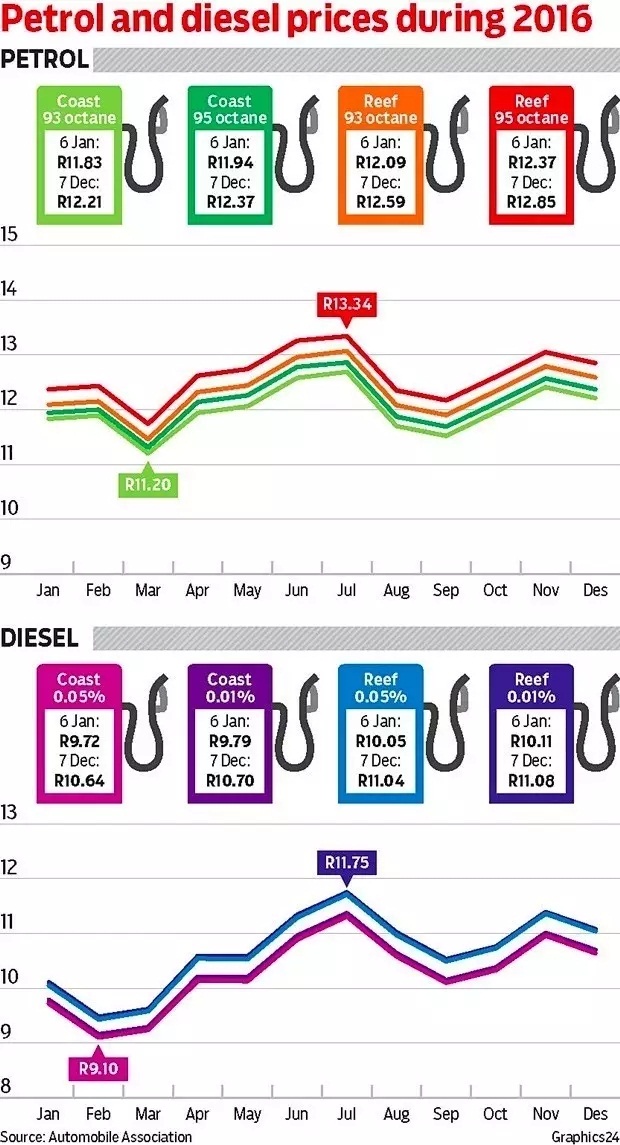 南非机动车协会(AA)14日提醒称,因国际燃油价格上涨,南非新年期间燃油价格或将上涨,预计汽油价格将每升上涨27分,柴油价格将每升上涨21分。AA还在近日公布了一年来南非燃油价格的浮动示意图。