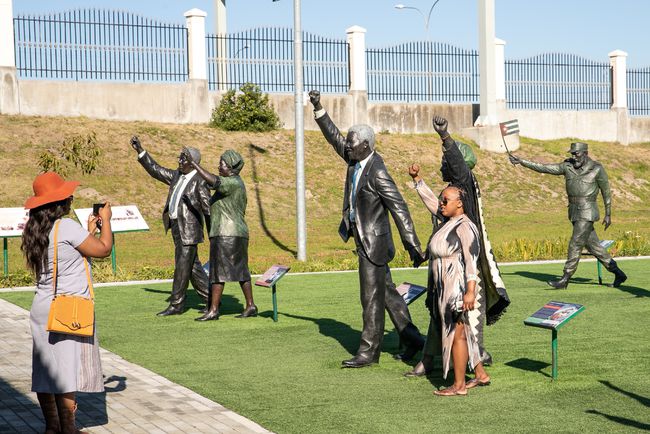 7月18日,在南非开普敦,一名游客和南非前总统纳尔逊·曼德拉及其夫人温妮·马迪基泽拉-曼德拉的铜像合影。