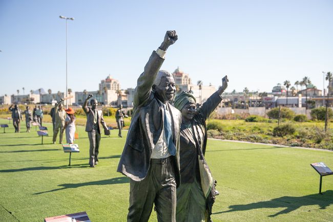 这是7月18日在南非开普敦拍摄的南非前总统纳尔逊·曼德拉和其夫人温妮·马迪基泽拉-曼德拉的铜像。