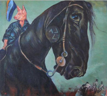 马布鲁的另一幅作品,骑在马上的是白人极右翼组织AWB的领导人布兰斯(Eugene Terre’Blance),他的脑袋被一个猪头所代替。布兰斯由于和工人的薪水纠纷,被用铁棍打死在自己家里。他死的时候不但脑瓜被打了个“万朵桃花开”,而且裤子被褪到了膝盖以下,生殖器裸露在外面。他死前究竟遭遇了什么,至今仍让人们浮想联翩。