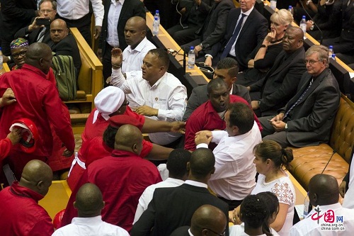 当地时间2015年2月12日,南非开普敦,南非总统祖玛在议会发表国情咨文,在演说期间,遭到反对党经济自由战士党议员打断,引发骚乱。议会保安人员要求扰乱秩序议员退场,遭到反对,双方发生肢体冲突。