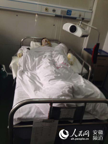 12月22日下午,小许躺在安徽省二院烧伤科病床上,头上、手上都缠着纱布。医生介绍,小许全身多处烧伤,烧伤面积约12%。小许虽脱离生命危险,但伤势集中在面部,以后有毁容的可能。