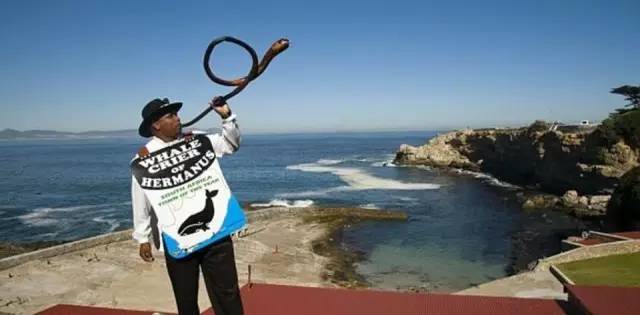 如果让我写一本关于鲸的小说,我想我会做的第一件事,就是打包行李,去赫曼努斯住上一年再说。赫曼努斯是公认的“世界最佳陆地观鲸地”,距离开普敦120公里,距离非洲大陆的最南端厄加勒斯角130公里,印度洋和大西洋洋流在这里交汇,带来了大量的鱼虾群,也吸引了大批鲸群造访此地。从德班到开普敦连绵近2000公里的南非海岸线上,能够看到37种鲸类和海豚。在赫曼努斯,能够看到的鲸鱼主要有座头鲸、布氏鲸、逆戟鲸以及南露脊鲸。每年5月至11月,座头鲸离开莫桑比克和安哥拉海域的热带水域,向南迁移到南非海岸线附近猎食和繁殖;布氏鲸一年四季都会在赫曼努斯附近出现;逆戟鲸也同样如此。而大约有3000至4000只南露脊鲸,会离开南极水域,向北迁移至西开普省沿岸繁殖后代。每年有数以十万计的游客涌入赫曼努斯观鲸,9、10月间,会举行一年一次的观鲸节——这一盛会已经有25年的历史。今年的举行时间是9月30日至10月2日。在此期间,人们会评选出本年的鲸鱼王子和鲸鱼公主,会有20位音乐家为人们带来超赞的演出,还可以品尝各种美食,以及购买鲸鱼手工艺品等。当然,在其他月份,一般是6月至11月,都可以在赫曼努斯观看鲸鱼,天气允许,还可以登船出海,近距离观察这些海中的庞然巨物。站在赫曼努斯高耸的海边崖壁上,可以俯瞰海面,视线中不会有什么遮挡,在双筒望远镜的帮助下,很容易寻找到在近海游弋的各类鲸鱼。尤其值得一提的是,赫曼努斯有一个全世界独一无二的职业,Whale Crier,工作职责就是当海面上出现鲸鱼时,吹响号角,提醒在赫曼努斯的游人赶紧来看。这个职业目前只有一个从业人员,事实上,历史上也仅有5个人从事过这份工作。现任Eric Davalala,从2011年开始担任赫曼努斯的Whale Crier。当时,他正在为自己的“成年礼”积攒资金,在报纸上看见赫曼努斯招聘Whale Crier的广告时,他对自己能否成功应聘心怀疑虑(因为他既不是赫曼努斯当地人,也缺乏学历或对自然的了解),但是Davalala的牧师鼓励他去试试看,结果他成功了。每年6月至10月,Eric每天上午10点到下午4点间,在赫曼努斯的海岸线搜寻着鲸鱼的行踪。他标志性的深色宽檐帽上插着羽毛,拿着海藻号角,非常醒目。有很多游客认为是Eric Davalala的号角声召唤来了鲸鱼,Eric说自己可没这样的本事。发现鲸鱼的号角声并不是只有一种,不同的号角声代表着可以观看鲸鱼的区域,这些信息会印在赫曼努斯当地的旅行手册上。Eric和他的前任的风格并不相同。Pieter Claasen以丰富得难以置信的观鲸知识和高冷的姿态而著称,Eric更具有亲和力,欢迎游客向他来问他鲸鱼在哪里。他也会主动和游客分享关于鲸鱼的知识。比如告诉大家,南露脊鲸之所以跃出水面,是为了摆脱恼人的鲸虱,便于海鸥俯冲下来啄取;但是刚产仔的南露脊鲸母鲸很少跃出水面,因为她们为哺育小鲸鱼耗费了大量能量,她们去除鲸虱的办法,是去海床粗粝的砂石上蹭痒。Birkenhead house酒店是赫曼努斯最有名的酒店之一,坐落在当地的峭壁之上,后排度假别墅浴室里的维多利亚风格独立浴缸,可以躺在里面观赏海景甚至鲸鱼,被认为是全世界最佳酒店浴缸之一。这间酒店的得名,来自于1852年10月25日沉没的英国皇家海军战舰“Birkenhead”号。战舰当时沿着非洲海岸行进,不幸触礁,开始下沉,舰上的最高阶军官苏格兰高地军团第74军的指挥官西顿上校向在甲板上列队的士兵们宣布,船上有限的救生艇将先把妇女和儿童运到岸边。没有人反对这个命令,士兵们毫不犹豫地执行了长官的命令。最终,救生艇从这艘载有632人的军舰上救出了近200位妇女和儿童,剩余的400多官兵随舰艇沉没。100年后的同一天,Birkenhead House酒店揭幕。1989年,Phil 和 Liz Biden对这座酒店进行重新改造。大理石地面、维多利亚式浴缸、墙上挂着的艺术家绘画作品手稿……每间客房的风格更不相同,阳台的风景非常开阔,或可眺望海景,或可欣赏山色,沃克湾一流的自然风光使客人无论看向酒店的任何方向都是一种愉悦的享受。而在酒店泳池边的早餐更是令人激动的体验,酒店泳池就在海边的岩壁上,礁石拍碎海浪,海风吹起细碎的水雾,在阳光的照耀下,泛起七彩的光芒,运气够好的话,也许能够看到鲸鱼妈妈带着幼鲸,在离海岸一百多米的地方享受着鲜虾早餐。这是大家最为熟悉的鲸鱼的呼吸方式,通过气孔喷射出水汽,同时发出巨大的声响。跳出水面,在空中挥舞巨大的胸鳍并伴有转体的动作。这通常是鲸鱼在与同伴进行交流,或是驱除身上的寄生虫。有些鲸鱼甚至可以连续做出3次到8次的跃起动作。使用胸鳍或尾巴猛烈拍打水面,发出巨大的声响。这是一种与同伴交流的沟通手段。头部与身躯垂直于水面探出,直至胸鳍露出水面为止,这是鲸鱼观察水面之上环境的一种行为。