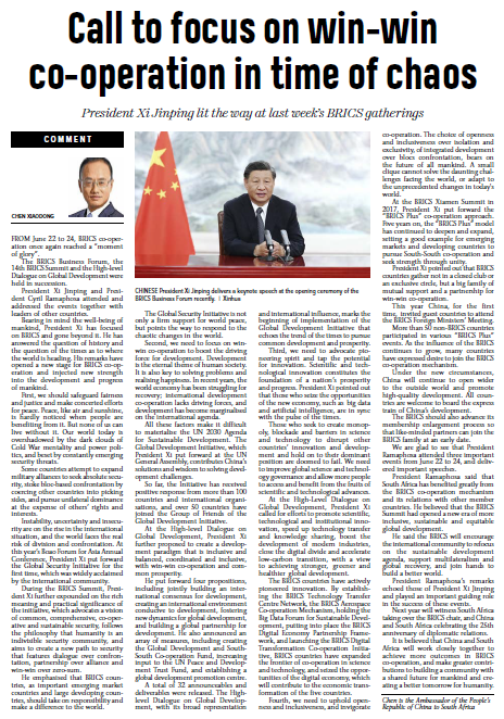 6月28日,南非主流媒体《比陀新闻报》《水星报》《开普时报》及独立传媒网站刊登驻南非大使陈晓东题为《解时代之题,聚前行伟力》的署名文章,全文如下: