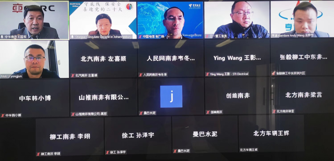7月13日,中国驻约翰内斯堡总领馆召开“守底线 保安全 喜迎党的二十大”制造业企业视频会。唐中东总领事、领区内约20家制造业企业负责人出席会议。南中经贸协会制造委员会会长、中国中车(南非)有限公司负责人王国军主持会议。