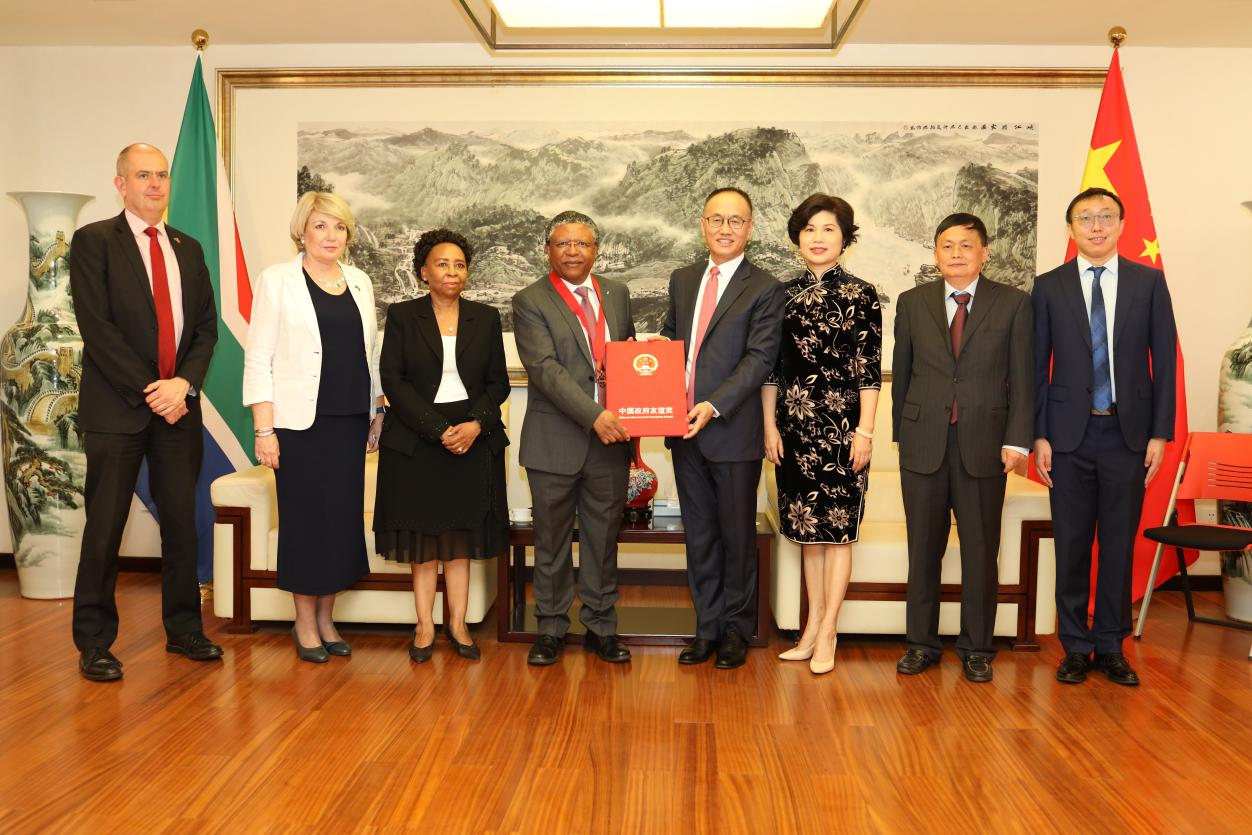 9月27日,驻南非大使陈晓东代表中国政府向南非林波波大学普蒂·埃兹罗姆·恩戈佩教授颁授2021年度中国政府友谊奖奖章和证书。南科创部副总司长杜特伊特、河北“燕赵友谊奖”获得者南非大学戴安教授、普蒂教授夫人等出席颁奖仪式。