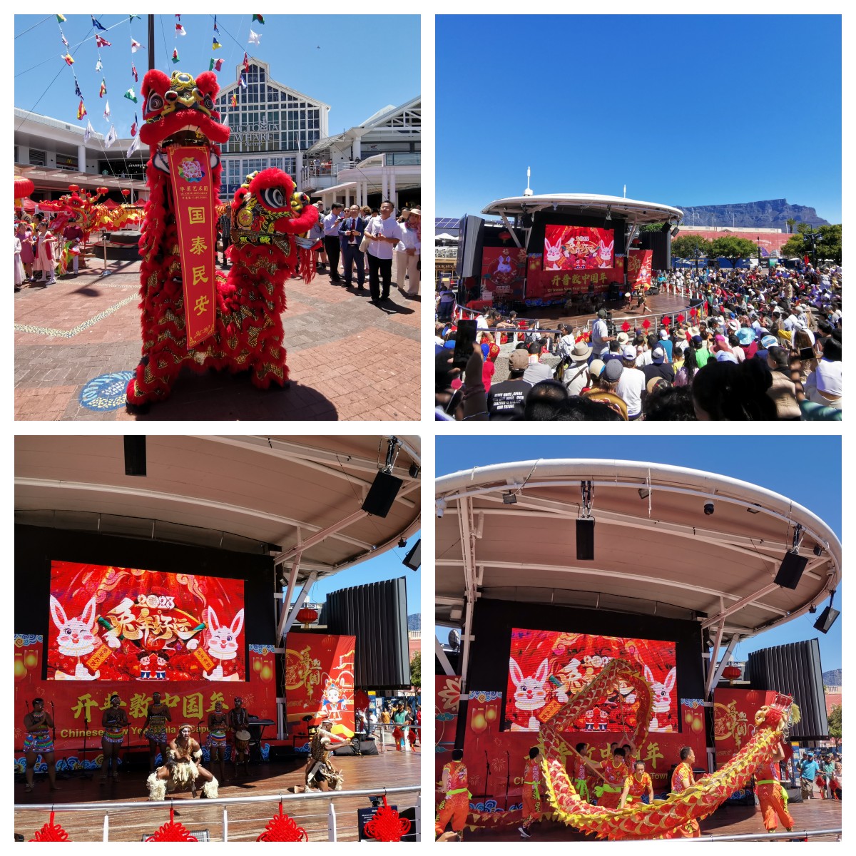 活动现场张灯结彩、喜气洋洋、热闹非凡,处处洋溢着欢乐祥和的节日气氛。表演场地周边的中国文化摊位也吸引了大量当地游客驻足,中国的熊猫更是成为了当地人争相合影的萌宠。舞龙舞狮、中国武术、旗袍秀、东方歌舞、祖鲁族舞蹈等节目精彩纷呈,将欢乐祥和的气氛推向高潮。