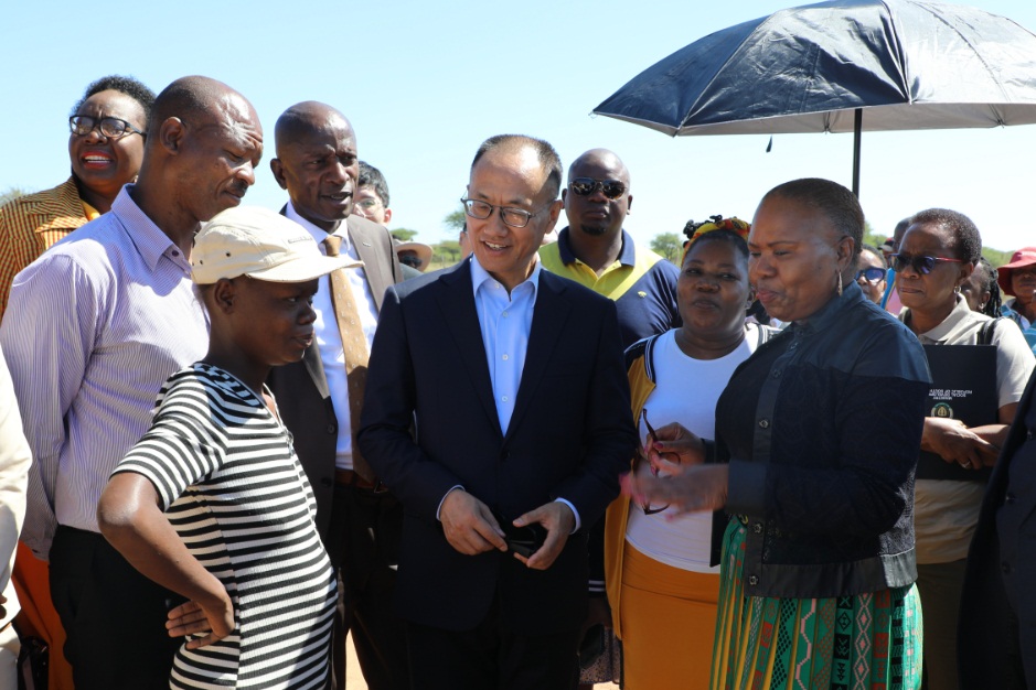 2023年4月14日,陈晓东大使与南非社会发展部长祖卢一同访问西北省莫瑞特勒市,考察当地乡村减贫情况并出席捐赠仪式。