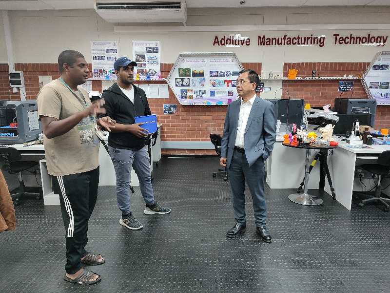 5月10日,驻德班总领事李志工、副总领事孙安林走访德班理工大学孔子学院和鲁班工坊。孔子学院中方院长吴林和鲁班工坊外方管理员陪同。