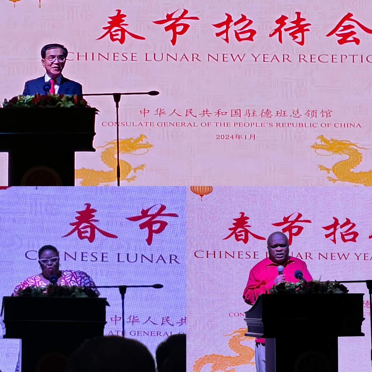 1月28日晚,驻德班总领馆举办龙年春节招待会。南非夸纳省副议长姆滕布、祖鲁王室代表普米王太妃、坦蒂王太妃、德班市米耶尼副市长、夸纳省和德班市政府有关部门代表、各党派议员、当地媒体和各界友人、各国驻德班领事、华侨华人和中资机构代表约300人出席。
