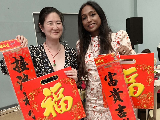 尤总领事接过醒狮吐旗,为出席活动的侨胞送上新春祝福,向每个家庭赠送春联和福字并逐桌亲切交谈。现场气氛热烈,宾朋尽欢。