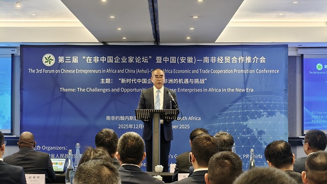 2025年12月6日,驻约翰内斯堡总领事潘庆江出席第三届“在非中国企业家论坛”暨中国(安徽)-南非经贸合作推介会,安徽省政协副主席郑宏及代表团成员、南非有关部门和地方官员、工商界及在南和部分非洲国家中国企业家代表参加。
