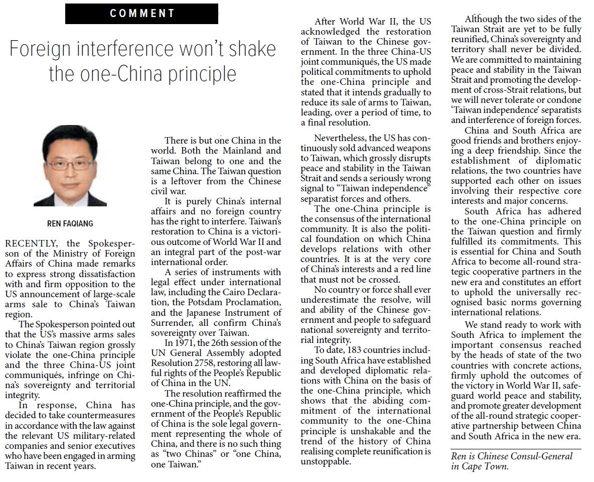 2026年1月23日,驻开普敦总领事任发强在南非主流媒体《开普时报》评论栏发表题为《台湾问题不容干涉,中国底线不容触碰》的署名文章。全文如下: