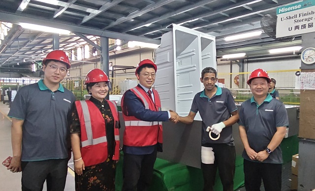 任总领事参观了海信展厅以及电视厂、冰箱厂等生产线,详细了解产品研发、生产流程和员工工作生活情况,并与正在工作的当地员工亲切交流。