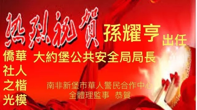 南非警民中心祝贺孙耀亨议员荣任大约堡市公共安全局局长