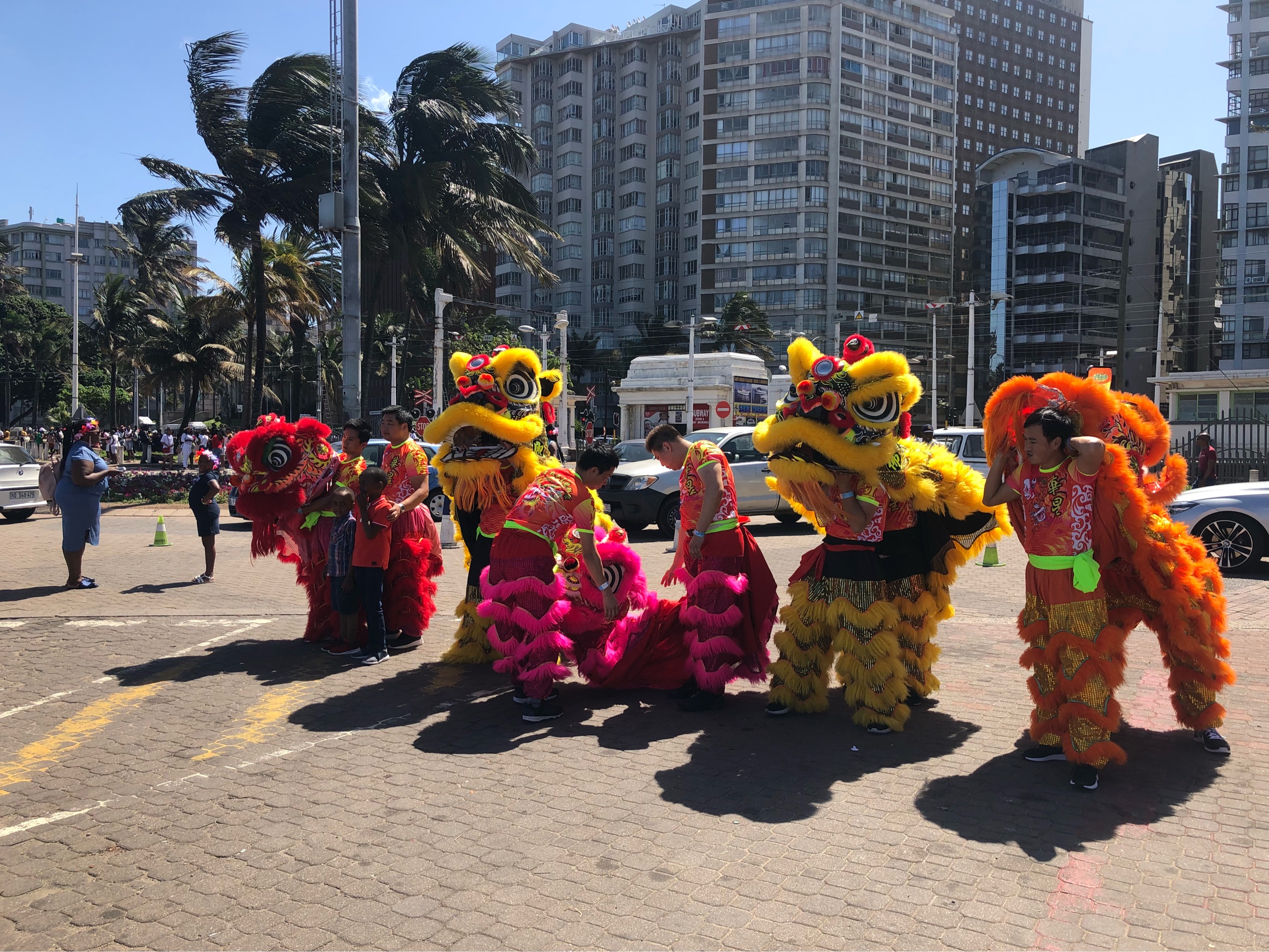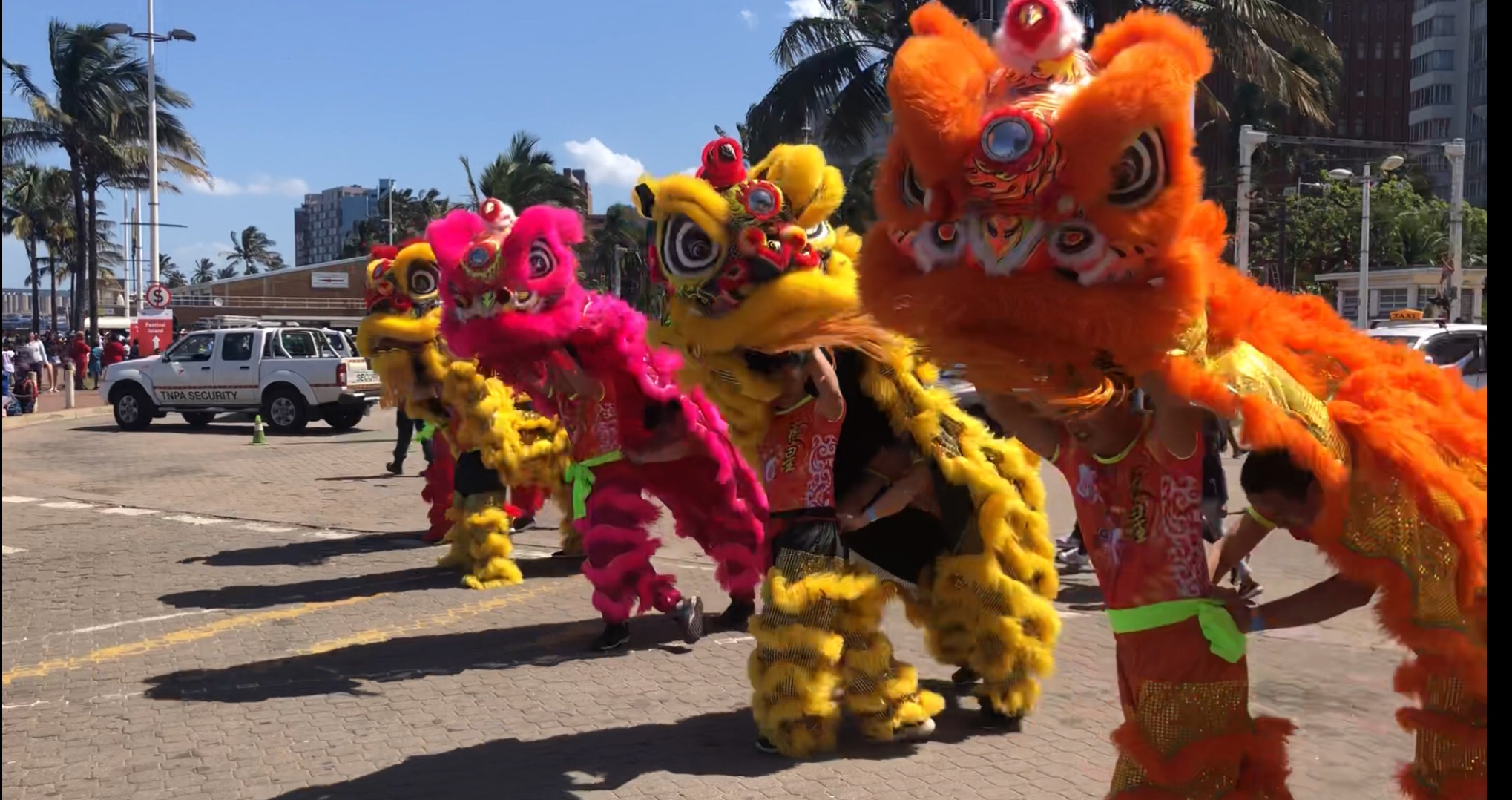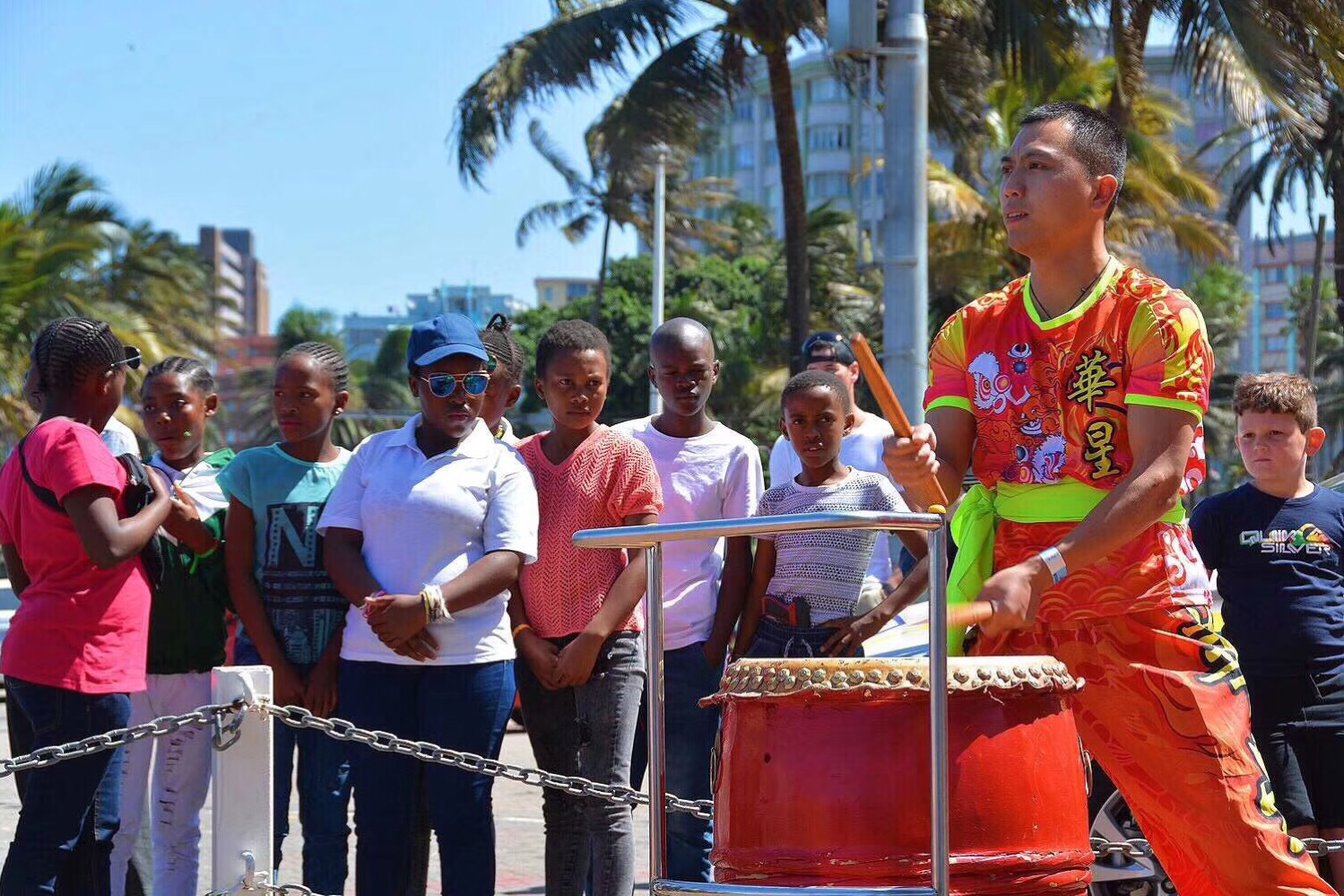 开普敦华星艺术团前去助阵,龙舞狮舞气势雄壮的鼓乐与旁边音乐会明快的非洲旋律相得益彰。这也是开普敦华星龙狮队首次应邀参加德班港口节的表演,为当地民众展现了精彩的龙狮文化。