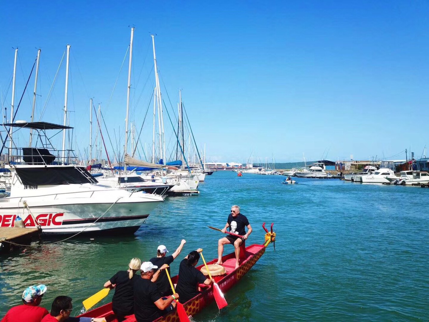 2018年德班第三届港口文化节,桅杆林立的德班游艇码头比往届多了一抹中国红,德班理工大学孔子学院的龙舟正式下水,德班侨界从此告别没有龙舟的历史。